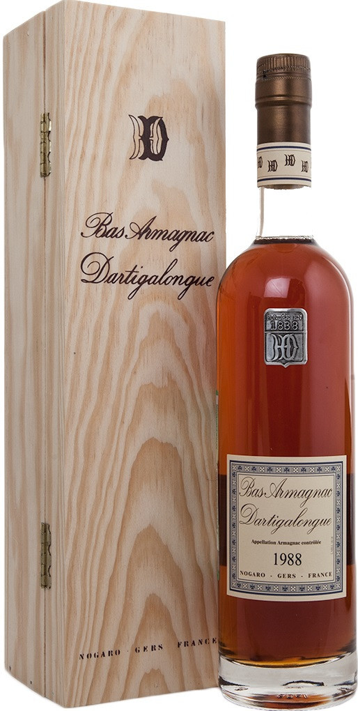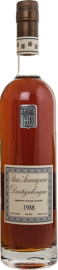 Dartigalongue, Bas Armagnac, 1988 — миллезимный арманьяк урожая 1988 года, созданный из лучших спиртов и выдержанный в дубовых бочках. Для изготовления арманьяка используется виноград сортов Уни Блан, Бако, Фоль Бланш, выращенные в регионе Ба Арманьяк, Гасконь. Винтаж 1988 года демонстрирует сложный аромат, мощный вкус и долгое послевкусие. Арманьяк является отличным дижестивом.