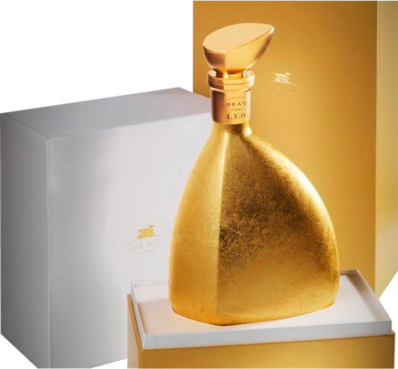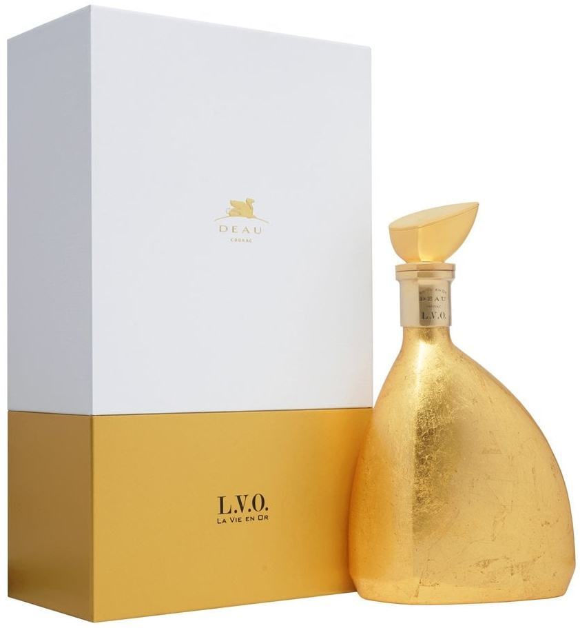 В честь празднования конца года бренд Deau представил уникальную, редкую и роскошную бутылку коньяка категории "Hours d’Age", настоящую драгоценность, украшенную сусальным золотом: L.V.O. "La Vie en Or". Исключительный графин, покрытый фольгой из 24-х каратного золота, хранит в себе секрет редкого винтажного искусства. Декантер представляет собой эксклюзивное ювелирное изделие, золотая фольга наносится вручную известным парижским ювелиром Артусом Бертрандом. Для производства коньячных спиртов используются виноград сортов Уни Блан, Монтиль, Коломбар и Фоль Бланш, которые выращиваются на старейших виноградниках региона Гран Шампань. Для создания коньяка "La Vie en Or", что дословно означает "Жизнь в Золоте", были отобраны самые старые спирты, которые в течение нескольких десятилетий выдерживались в подвалах из известняка. Коньячные дистилляты были выдержаны в бочках из лимузинского дуба на протяжении 60-100 лет. Над созданием этого коньяка работало несколько поколений технологов. L.V.O. предназначен для истинных ценителей и коллекционеров, чувствительных к ароматической сложности и уникальному дизайну бутылки.