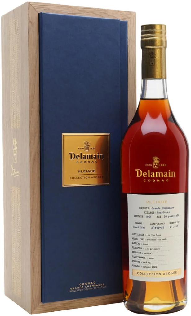 Исключительный коньяк Delamain, "Pleiade", "Collection Apogee" Ancestral происходит из крошечной деревушки Веррьере в Гранд Шампань. Лучшие спирты для "Collection Apogee" были вручную отобраны прежним директором Delamain, Жаном Деламеном, который прославился своими работами в сфере ботаники и естественных наук, а также за свое инстинктивное понимание природы коньяка. Коньяк в течение многих десятилетий выдерживался в бочке из французского дуба объемом 350 литров из леса Тронсэ. Старый, выдержанный дуб снижает влияние танинов и позволяет терруару выразить себя, делая коньяк удивительно аутентичным и элегантным. Бочка была расположена рядом с влажной стеной и дверью, где год за годом извлекала выгоду из температурных колебаний и воздушного потока, превращая содержащийся в ней напиток в коньяк возвышенной интенсивности и богатства. В январе 2021 года коньяк был бутилирован в количестве всего 180 бутылок, каждая из которых имеет свой уникальный номер.