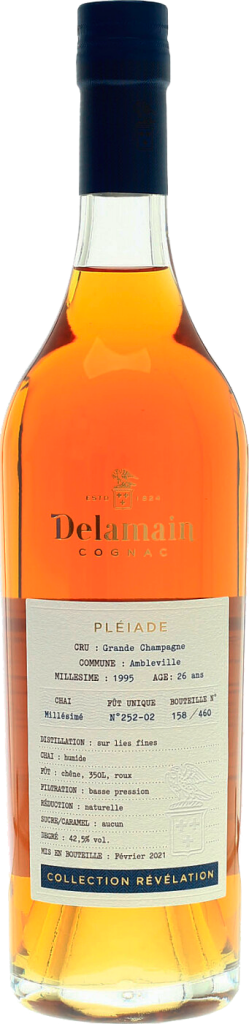 Коньяк "Collection Revelation" Ambleville, 1995 происходит из небольшой деревушки Амблевиль, что в южной части лучшего конячного терруара — Гранд Шампань. Расположенные над линией геологического разлома, лозы в Амблевиле извлекают выгоду из оптимальных почвенных условий, а корни достигают большой глубины в меловой подпочве. Первую половину срока коньяк выдерживался в старой бочке из лимузенского дуба объемом в 350 литров. Старый, выдержанный дуб снижает влияние танинов и позволяет аромату лоз и терруара переходить в коньяк, делая его удивительно аутентичным и элегантным. Позже коньяк перевели в старую бочку из мелкозернистого дуба Тронсе, для заключительной стадии созревания и эволюции.