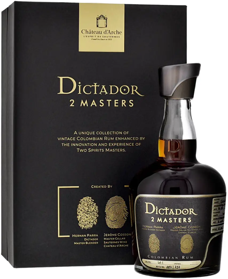 Благородный ром Dictador, "2 Masters" Chateau d'Arche был создан при сотрудничестве с винным домом "Chateau d'Arche". Тираж партии составил 390 бутылок. Для производства был использован свежеотжатый сок сахарного тростника, сброженный на собственных дрожжах. Дистилляция была осуществлена в 1980 году, частично в медном перегонном кубе, частично в стальной колонне непрерывного действия. Выдержка спиртов производилась в дубовых бочках из-под виски на протяжении 37 лет. Далее спирты дозревали в течение 6 месяцев в старых барриках из-под сотерна "Chateau d'Arche".