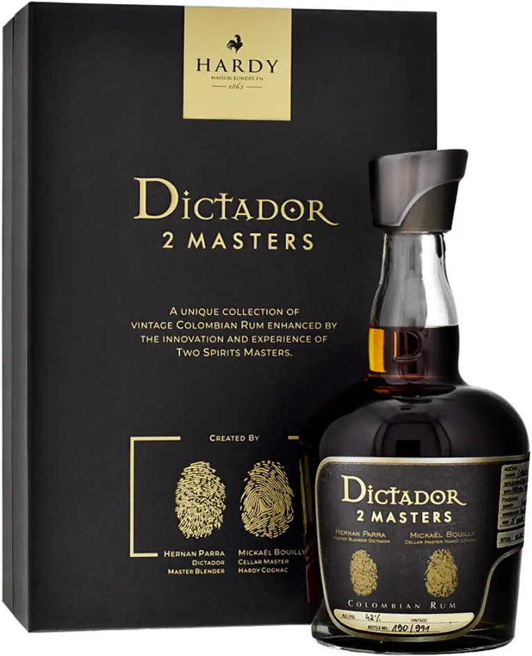 Благородный ром Dictador, "2 Masters" Hardy был создан при сотрудничестве с коньячным домом "Hardy". Тираж партии составил 360 бутылок. Для производства был использован свежеотжатый сок сахарного тростника, сброженный на собственных дрожжах. Дистилляция была осуществлена в 1976/78 годах, частично в медном перегонном кубе, частично в стальной колонне непрерывного действия. Выдержка спиртов производилась в различных дубовых бочках на протяжении 39-41 года. Далее спирты дозревали в течение 7 месяцев в 350-литровых дубовых бочках легкого обжига из-под коньяка "Hardy" 1954 года.