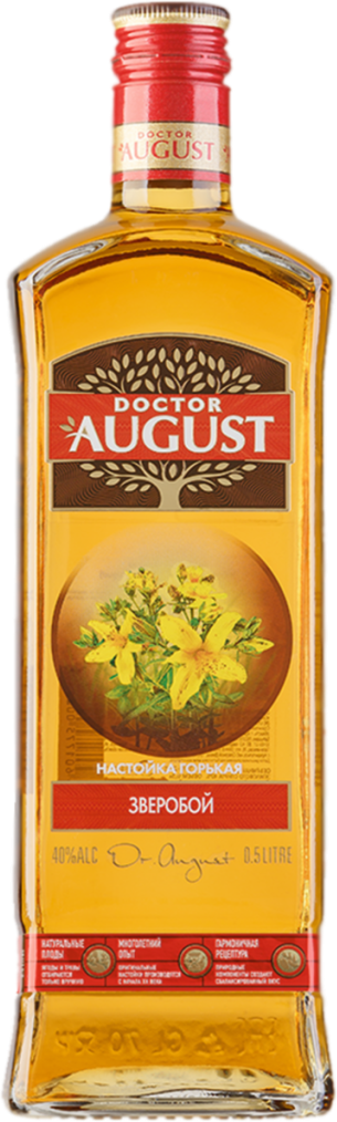 Доктор Август, Зверобой — горькая настойка из серии "Доктор Август" от Мариинского ликеро-водочного завода. Водка из зверобоя была одной из самых популярных в России в XIX веке. Зверобой входил в состав практически всех бальзамов, которые употреблялись не только как алкогольный напиток, но и как лекарство. Целебные свойства зверобоя известны с давних пор. В химическом составе зверобоя содержатся железо, кальций, калий и магний. Настойка "Доктор Август" кроме зверобоя включает также такие лекарственные травы, как душица и донник. Глубокое извлечение из трав биологически активных веществ происходит по специальной технологии экстрагирования.