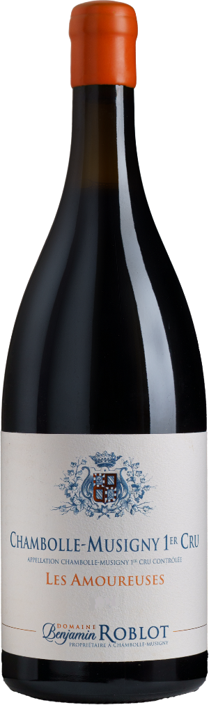 Domaine Benjamin Roblot, Chambolle-Musigny 1er Cru, Les Amoureuses — сложное, великолепно структурированное вино, в которое невозможно не влюбиться. Оно изготавливается из винограда сорта Пино Нуар, который собирается вручную с виноградника "Лез Амурез" класса Премье Крю, самого известного и часто считающегося лучшим из 24-х Премье Крю в Шамболь-Мюзиньи. Терруар здесь немного отличается от более северных районов Шамболь-Мюзиньи. Меловая почва на этом конце коммуны состоит из тонкого каменистого слоя, расположенного поверх твердой известняковой подпочвы. Естественно низкая урожайность приводит к получению мелких концентрированных ягод. Склон "Les Amoureuses" скорее ступенчатый, чем однородный, с выгодной юго-восточной экспозицией. Посаженные здесь лозы получают много утреннего солнечного света, необходимого для фенольной зрелости, а прохладные бургундские вечера сохраняют свежую кислотность, что обеспечивает идеальный баланс. Все участки, принадлежащие Domaine Benjamin Roblot, с 2003 года обрабатываются органическими методами.