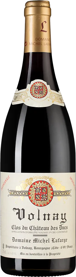 Domaine Michel Lafarge, Volnay 1-er Cru, Clos du Chateau des Ducs — красное сухое вино, созданное из отборного винограда сорта Пино Нуар. Ягоды произрастают на виноградниках хозяйства Домен Мишель Лафарж на известково-гравийных почвах Юрского периода. На виноградниках применяются органические и биодинамические методы возделывания лозы. Сбор урожая проводится вручную, на винодельне ягоды подвергаются дестеблированию с последующим прессованием при помощи пневматического пресса. Ферментация с выбранными дрожжами проводится при строго контролируемой температуре. Выдерживается вино 18 месяцев в старых бочках из французского дуба. Потенциал вина составляет 10-15 лет.