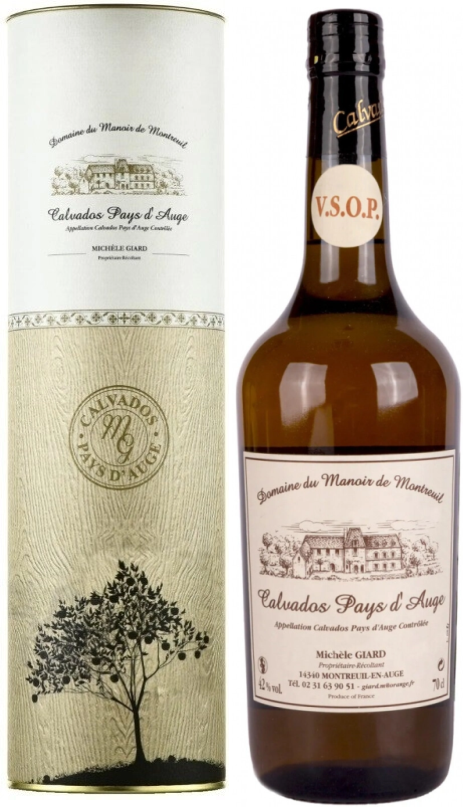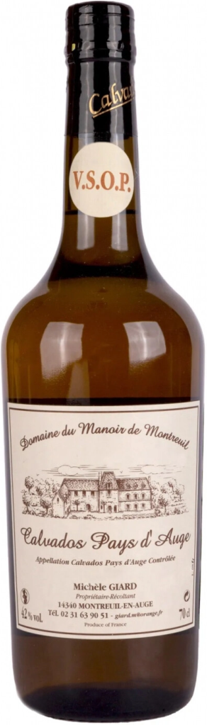 Domaine du Manoir de Montreuil, Calvados Pays d'Auge, VSOP — выдержанный кальвадос с восхитительно богатым ароматом и щедрым вкусом. В купаж кальвадоса входят яблочные спирты высшего качества, созданные путем двойной дистилляции из натурального яблочного сидра из сладких, горько-сладких, кислых и горьких сортов яблок. Яблоки выращиваются в собственных садах компании. Жиар ждет, пока плод упадет на землю, прежде чем собрать его. Так делали его предки. Фермент сидра хранится в тонно и выдерживается в больших бочках в течение года перед дистилляцией. После двойной перегонки в газовом перегонном кубе, купленном в 1998 году в регионе Коньяк, яблочный дистиллят разливается в различные дубовые бочки. Жиар предпочитает полировать концы некоторых бочек, а не покупать новые. Эти бочки опорожняются и наполняются заново каждые пару лет, а затем постепенно заполняются дождевой водой. Выдержка кальвадоса ВСОП длилась не менее 6 лет.