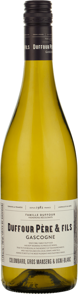 Duffour Pere et Fils, Colombard, Gros Manseng & Ugni Blanc — свежее, нежное белое полусухое вино, изготовленное из винограда сортов Коломбар, Гро Мансенг и Уни Блан. Уни Блан относительно нейтральный, но с приятной свежей кислотностью. Коломбар дает свежие, живые и сочные вина с цветочным характером. Гро Мансенг придает купажу несколько более пряный характер. Сочетание этих сортов винограда дает восхитительное, несложное белое вино. Виноград выращивается в Гаскони юго-западе Франции. Лозы, посаженные на смеси глины и известняка, в настоящее время имеют средний возраст 30 лет. Что необычно для плодородного региона Гаскони, Duffour Pere et Fils активно поощряет низкую урожайность за счет серьезной обрезки, создавая таким образом большую концентрацию в готовом вине. Превосходный купаж Коломбара, Гро Мансенга и Уни Блана демонстрирует чистый и современный стиль без какого-либо влияния дуба. Собранный виноград проходит пневматическое прессование. Каждый сорт винифицируется отдельно в стальных чанах и созревает на осадке в течение нескольких месяцев перед купажированием, которое проводится непосредственно перед розливом вина в бутылки.