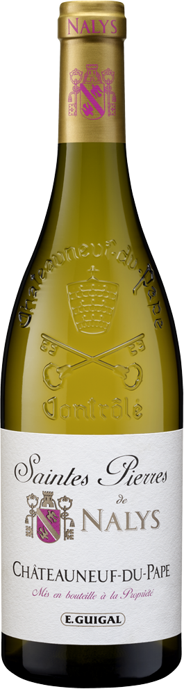 Saintes Pierres de Nalys" Blanc, Chateauneuf-du-Pape — изысканное белое сухое вино, в производстве которого используется виноград сортов Кларет, Бурбуленк, Руссан, Гренаш Блан и Пикардо. Ягоды произрастают на виноградниках Шато де Налис "Nalys", "Bois Senechal" и "La Crau". Почвы состоят из красного песчаника, ронского булыжника и камней. Средний возраст виноградных лоз составляет 45 лет. Сбор урожая проводится вручную, на винодельне плоды подвергаются сортировке с последующим бережным прессованием. Ферментация проводится в стальных резервуарах при температуре 18 °С. Выдерживается вино в барриках (20%) и в нейтральных чанах (80%) в течение 8 месяцев.