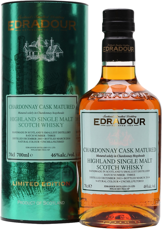 Edradour, Chardonnay Cask Matured, 2003 — односолодовый шотландский виски, дистиллированный в 2003 году. На последнем этапе виски выдержан в бочках из-под Шардонне и бутилирован без холодной фильтрации.
