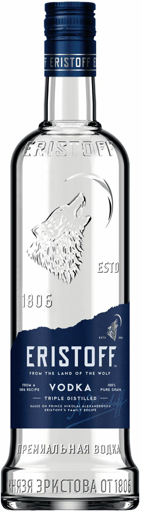 Водка премиум-класса "Эристофф" имеет русские корни и отличается французским качеством. Сегодня она производится во Франции по оригинальному рецепту князя Николая Александровича Эристова, разработанному им в Санкт-Петербурге в 1806 году. В 1956 году бренд Eristoff был приобретен компанией Count Martini&Rossi, которая в 1993 году влилась в группу Bacardi. Завод Eristoff расположен на Юго-Западе Франции в Провансе на берегу Роны. Для производства водки "Эристофф" используется сырье высочайшего качества: артезианская вода, источник которой расположен в 35-ти километрах от источника минеральной воды Perrier, отборная пшеница, рожь и пророщенные зерна пшеницы. Использование уникальной зерновой смеси позволяет добиться особой мягкости водки, а пористая вулканическая почва, богатая карбонатом калия, дополнительно обогащает и очищает применяемую воду. Процесс производства включает в себя угольную фильтрацию и трехступенчатую дистилляцию.