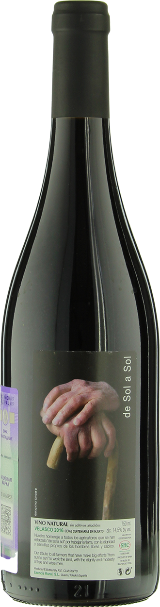 Esencia Rural, "de Sol a Sol" Natural Velasco — мощное и концентрированное натуральное красное вино, изготовленное по старинным ремесленным методам из винограда сорта Тинто Веласко, собранного со 150-летних лоз. Виноградник с почвой из песка, глины и известняка культивируется биодинамическими методами, без использования химикатов и пестицидов. Винификация включает длительную самопроизвольную мацерацию на кожице в течение 8 месяцев и 14-месячную выдержку в старых барриках. Стабилизация проходит естественным путем, фильтрация не производится. В течение всего процесса виноделия диоксид серы не добавляется. Вино может прекрасно храниться как минимум 10 лет.