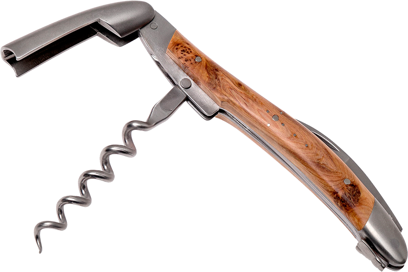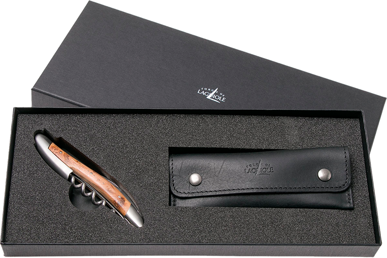 Конструкция изделия полностью выполнена из нержавеющей стали. Этот материал гармонично сочетает в себе высокую механическую прочность при малом весе. Аксессуар не требует особого обращения и не боится воздействия влаги. Его рукоять изготовлена из древесины можжевельника. Длина штопора Forge de Laguiole Sommelier Genevrier в сложенном виде всего 12 см. В верхней части он имеет удобный складной нож для срезания фольги с горлышка бутылки. В комплекте с товаром идет солидный кожаный чехол, с которым его можно безопасно переносить даже в кармане. Штопор Форж де лайоль Сомелье Можжевельник собирается вручную, поэтому на него дается пожизненная гарантия. Поставляется он нашим интернет-магазином в оригинальной деревянной коробке.