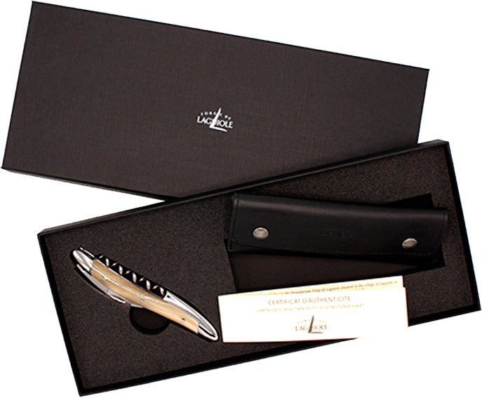 Штопор Forge de Laguiole Sommelier Horn Tip поставляется в солидной деревянной коробке, что позволяет использовать его в качестве солидного подарка. В комплекте также идет стильный кожаный чехол и сертификат подлинности.