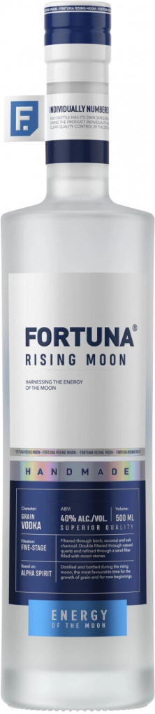 Водка "Fortuna" Rising Moon — инновационный продукт нового поколения, продукт синергии современных земных технологий, натуральных ресурсов Земли и энергии Растущей Луны, которая влияет на все биодинамические процессы из Космоса. Название водки "Rising Moon" в переводе с английского означает "растущая Луна". Луна в силу гравитации оказывает влияние на Землю, приливы и отливы, природные ритмы и на процессы роста. Луна напоминает нам, что в природе всё циклично, как в бизнесе и в жизни.