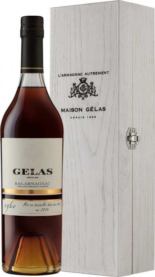 Миллезимный арманьяк Gelas "Bas Armagnac" 1960 изготовлен из винограда сортов Бако и Уни Блан, выращенных в регионе Bas Armagnac (Нижний Арманьяк). Арманьяк выдержан в бочках из черного дуба, передающего напитку интенсивный цвет и специфический характер.