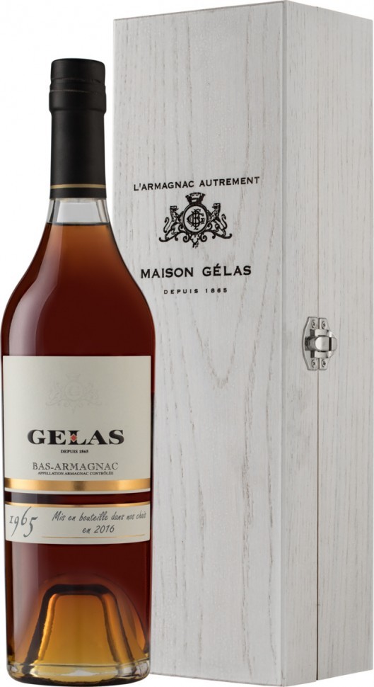 Миллезимный арманьяк Gelas, Bas Armagnac, 1965 изготовлен преимущественно из винограда сорта Бако с небольшим добавлением винограда Уни Блан, выращенных в регионе Bas Armagnac (Нижний Арманьяк). Арманьяк выдержан в бочках из черного дуба, передающего напитку интенсивный цвет и специфический характер.