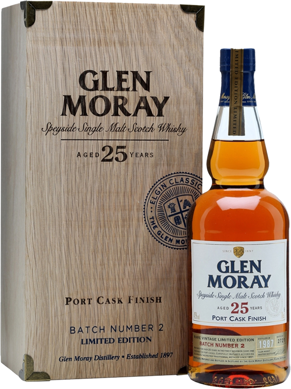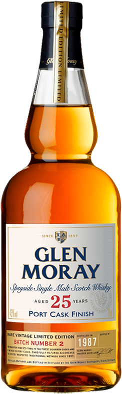 Великолепный односолодовый шотландский виски "Glen Moray" 25 Years Old Port Cask Finish выпущен ограниченным тиражом 3295 экземпляров в рамках коллекции редких, почтенного возраста, напитков. Каждая бутылка была подписана лично мастером дистиллером, Грэмом Коуллом, который следил за сложным процессом изготовления. Первую длительную 25-летнюю выдержку виски прошел в бочках из-под бурбона, а затем был помещен в бочки из-под портвейна, где получил сладковатые фруктовые нотки в свой сложный, пряный букет.