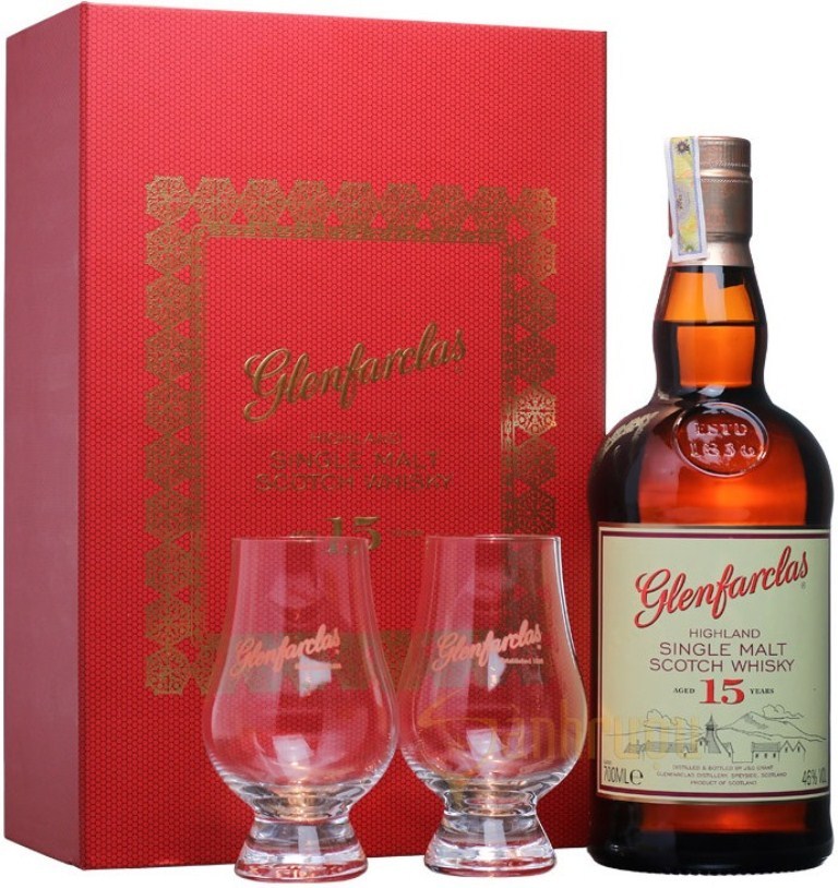 Роскошный набор, состоящий из бутылки виски "Glenfarclas" 15 years объемом 700 мл и двух бокалов, станет достойным презентом дорогому и близкому человеку.
