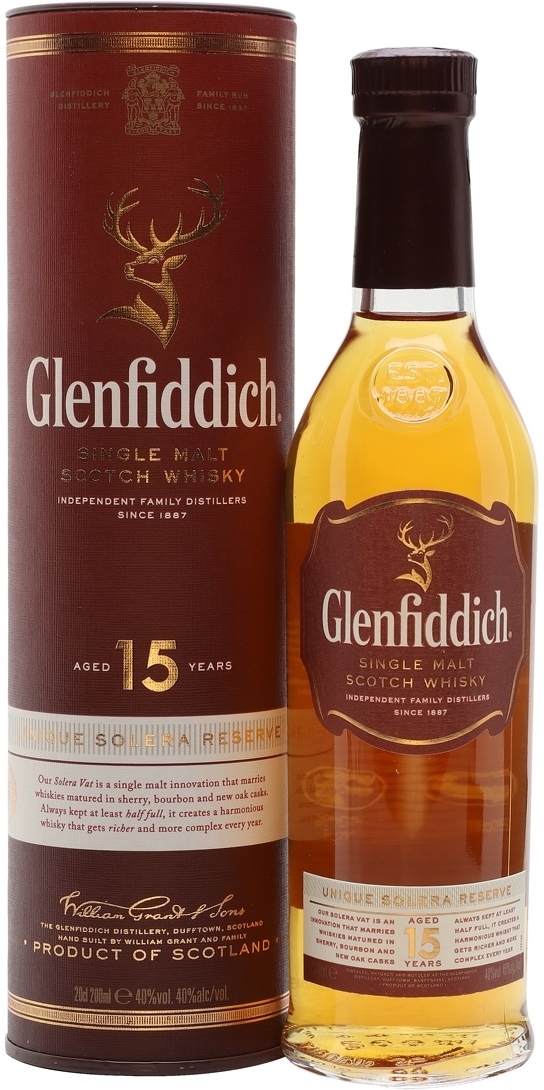 Glenfiddich 15 Years Old — богатый односолодовый виски 15-летний выдержки, который созревает в трех типах дубовых бочек: из-под бурбона, хереса и новой дубовой древесины. Затем напиток перемещается в уникальную, сделанную вручную бочку The Glenfiddich Solera Vat. Особенность выдержки в этой бочке заключается в том, что Solera Vat никогда не бывает пустой, уровень виски не опускается менее чем на ½, в результате он получается гармоничным, с богатым, ярким букетом и особым характером.