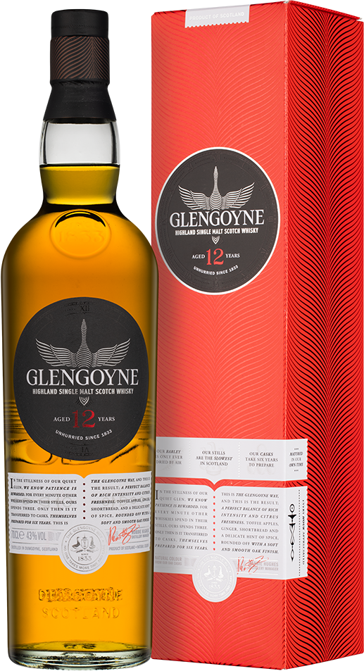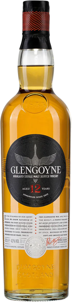 Glengoyne, 12 Years Old — "нежный и восхитительный... впечатление от его дегустации — замечательный сюрприз", написал в своей "Библии Виски" известный эксперт Джим Мюррей. Виски обладает натуральным и очень красивым золотым цветом, тонким и сложным ароматом и превосходным долгим вкусом с обилием разнообразных оттенков. Как и другие виски из диапазона Гленгойн, он производится из золотого ячменного солода, высушенного с помощью теплого воздуха, торф для сушки производитель никогда не использует, сохраняя тем самым богатый природный аромат солода. После очень медленной перегонки, более медленной, чем у кого-либо из производителей в Шотландии, виски выдерживается в тщательно отобранных бочках из-под хереса в течение 12 лет.