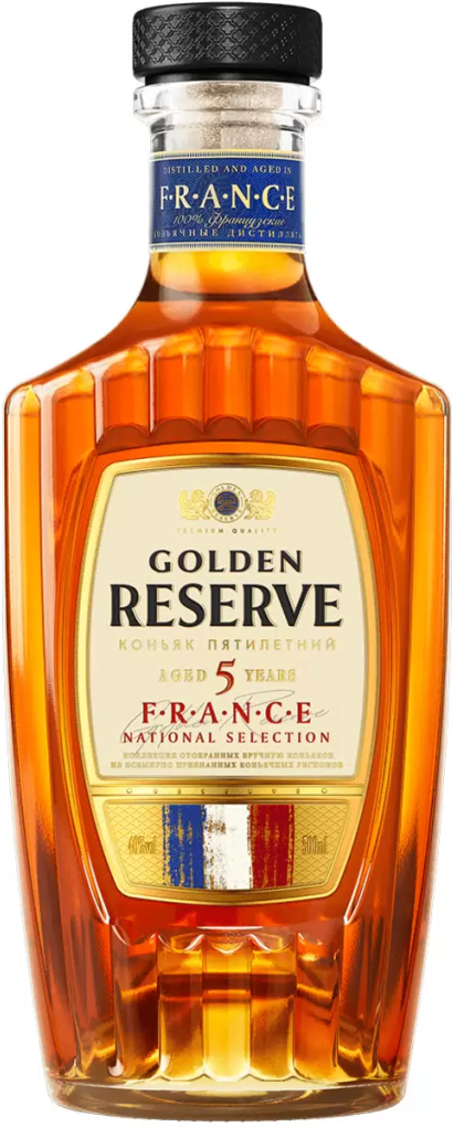 "Golden Reserve" National Selection France — это монокупаж, дистилляты для которого создаются во французском регионе Лангедок-Руссильон с выдержкой в дубовых бочках на протяжении 5 лет, что позволяет добиться глубокого и многогранного вкуса. Премиальный дизайн — элегантная рифленая бутылка и этикетка с флагом Франции, украшенная эмбоссингом и имитацией золота, — подчеркивает изысканный характер напитка. Изготовление коньяка "Золотой Резерв" осуществляется на пермском заводе "Бастион" ("Уралалко").