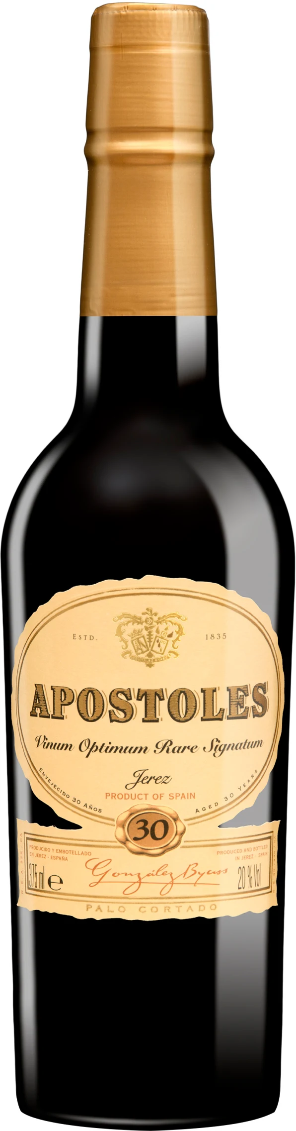 Замечательный херес "Apostoles" Palo Cortado был создан в 1862 году в память о посещении королевой Изабеллой II винного завода и погребов Gonzales Byass. Пало Кортадо является редкой разновидностью хереса, который начинает свою жизнь как Фино, но со временем теряет пленку из хересных дрожжей ("флёр") и далее продолжает старение как Олоросо. Херес созревает в дубовых бочках на протяжении 30 лет, из них последние 10 лет его выдерживают по системе "солера". Глубокий, невероятно богатый, гармоничный и полный вкус вина по достоинству оценят любители и знатоки хереса.