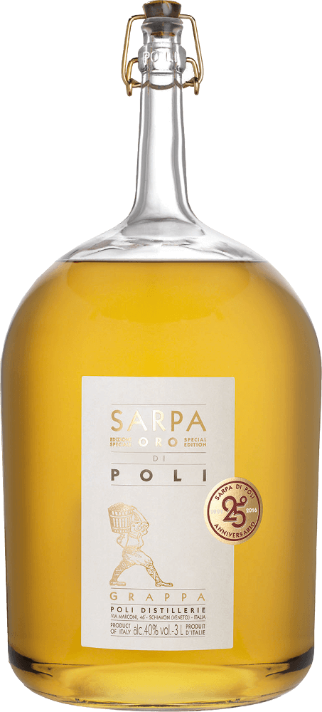 Sarpa Oro di Poli — граппа, созданная из винограда сортов Мерло и Каберне, и выдержанная в течение четырех лет в бочках из французского дуба объемом 225 литров. Граппа демонстрирует элегантный аромат, в котором гармонично сплелись ноты цитрусовых и экзотических фруктов, ванили и лакрицы, и полный, богатый вкус с продолжительным послевкусием.