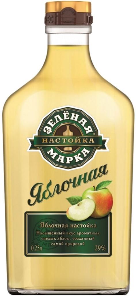 Зеленая Марка, Яблочная — сладкая настойка, которая привлекает мягким вкусом, приятным яблочным вкусом и ароматом. Настойка изготавливается из высококачественного спирта класса "Люкс", артезианской воды, сахарного сиропа и настоя спиртованного из сушеных яблок. Дизайн этикетки был разработан собственной дизайн-студией группы компаний "Руст" в Лондоне. Оформление подчеркивает натуральность ингредиентов и служит идеальным обрамлением для красивого соломенно-золотистого цвета напитка.