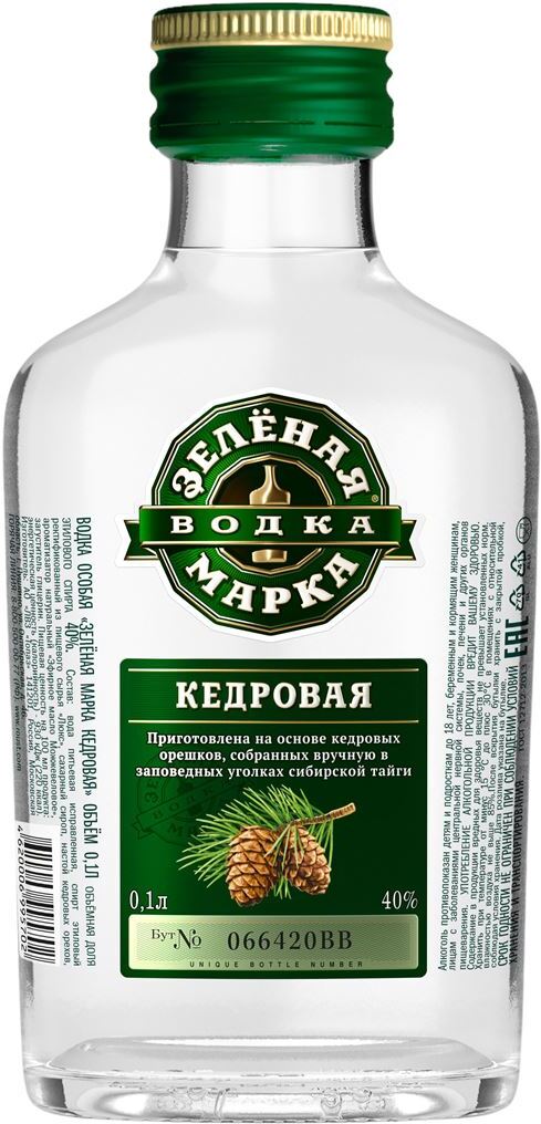 Зелёная Марка, Кедровая — мягкая водка с тонами кедра во вкусе и аромате, созданная в России. В ее состав входит чистая питьевая вода, ректифицированный этиловый спирт, сироп из сахара и фильтрованный настой кедрового ореха. Этот настой готовится в специальных емкостях на протяжении 10 дней, после чего добавляется в водку, придавая ей нюансы натуральных эфирных масел российского кедра.