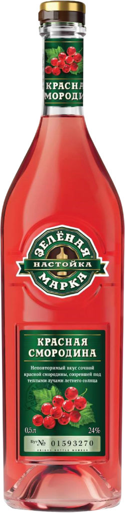 Зеленая Марка, Красная Смородина — сладкая настойка со вкусом сочной красной смородины, согретой жаркими лучами летнего солнца. Настойка производится на основе натуральных ингредиентов, таких как высококачественный спирт класса "Люкс", вода, сахарный сироп, концентрированный сок красной смородины, с добавлением натуральных пищевых ароматизаторов и красителей. Простой и гармоничный дизайн подчеркивает природное происхождение настойки. "Зеленая Марка" Красная Смородина подарит теплую атмосферу летнего вечера в любое время года.