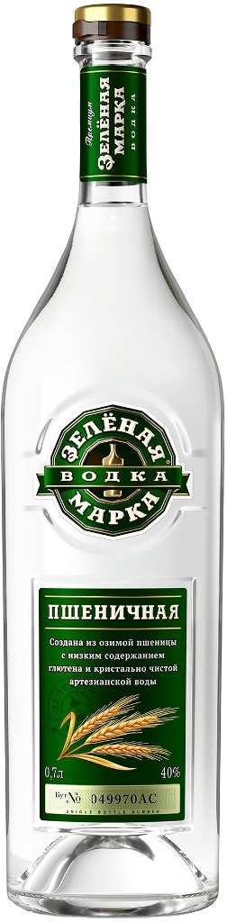 Водка "Зеленая Марка" Пшеничная производится из озимой пшеницы с низким содержанием глютена и чистейшей артезианской воды. В ее основе находится спирт класса Люкс, настой пшеницы и спельты, сахарный сироп, пищевая молочная кислота и натрий двууглекислый. Водка выдерживается в специальных экстракторах и поддается фильтрации в несколько этапов, пока не станет прозрачного цвета. Рекомендуется подавать напиток в охлажденном виде к жирным и острым горячим блюдам русской, украинской и белорусской кухни, икре и соленьям.