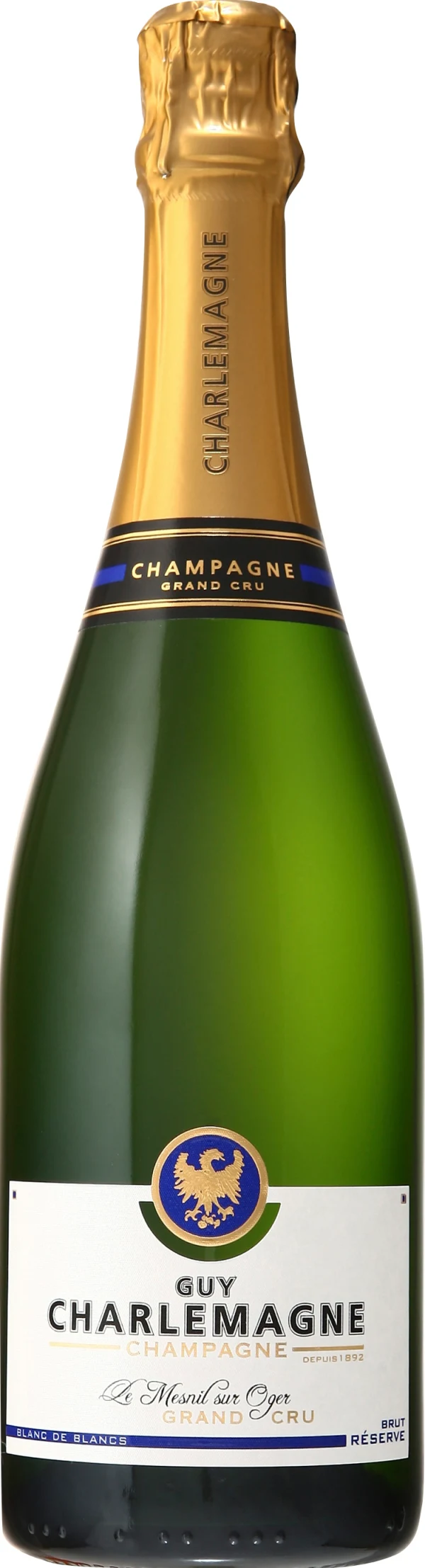 Guy Charlemagne, Reserve Brut Grand Cru Blanc de Blancs — великолепное, исключительно элегантное шампанское, в котором легкость и утонченность играют главную роль. Виноград сорта Шардоне, из которого изготавливается кюве, выращивается на лучших виноградниках класса Гран Крю в Мениль-сюр-Ожер, на известняковых почвах. Сбор урожая осуществляется исключительно вручную, как правило, в сентябре в момент оптимальной зрелости винограда. Собранный виноград деликатно прессуют при помощи двух традиционных прессов, каждый из которых способен обработать 4 000 кг. Далее начинается стадия медленной ферментации в чанах из нержавеющей стали при тщательном контроле температурного режима. После ее окончания наступает время купажирования, когда устанавливается пропорция вин с различными органолептическими качествами. Каждый год купаж отличается от предыдущего, а виноделы стараются достичь особой гармонии, которая придаст винам уникальность и неповторимость. После смешивания вино бутилируется и выдерживается 3 года в меловых подвалах, где в темноте и холоде кюве терпеливо созревает, чтобы быть достойным носить эмблему Дома Ги Шарлемань на своей этикетке.