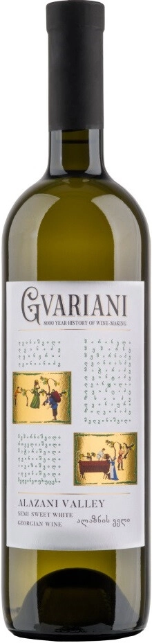 Gvariani, Alazani Valley White — ординарное белое полусладкое вино, для изготовления которого используют отборный виноград сортов Ркацители и Мцване Кахури. Ркацители привносит в купаж нотки зеленого яблока и белого персика, а Мцване — оттенки тропических и цитрусовых фруктов. Сухой и жаркий климат Алазанской долины идеально подходит для выращивания винограда. Почвы района — аллювиальные и делювиальные, также присутствует чернозем, карбонатный гумус и суглинок. Процесс винификации протекает по традиционному методу производства белых вин.