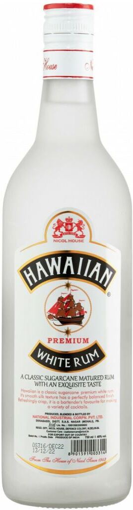 Hawaiian Premium White Rum — классический индийский белый ром премиум-класса, для изготовления которого используют сахарный тростник. Его гладкая, шелковая текстура и идеально сбалансированное послевкусие нашли много поклонников среди ценителей невыдержанного рома. Освежающе хрустящий, он любим барменами за универсальность, так как идеально подходит для приготовления различных коктейлей.