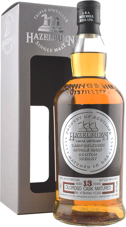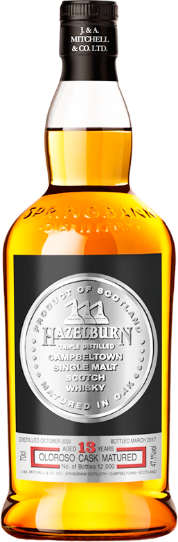 Hazelburn, 13 Years Old Oloroso Cask Matured — односолодовый виски тройной дистилляции, который выпускается ежегодно в небольших количествах после созревания в разных типах бочек из-под хереса. Свое название "Hazelburn" получил в честь старой винокурни Кэмпбелтауна, принадлежащей компании Springbank. Большинство зданий завода сохранилось до наших дней, хотя завод уже давно не функционирует. "Хазелберн" 13-летний был дистиллирован в октябре 2004 года и выдерживался в бочках из-под хереса Олоросо. Розлив виски без холодной фильтрации состоялся при крепости в 47,4% в апреле 2018 года. Релиз составил 9000 бутылок.