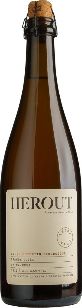 Herout, Grande Cuvee Extra Brut, Cotentin Biologique — натуральный фильтрованный газированный сидр, в производстве которого используется органический яблочный сок. Maison Hérout имеет фруктовый сад площадью 10 га, состоящий из высокоствольных (30%) и низкостебельных (70%) садов. Средний возраст яблонь варьируется от 10 до 65 лет. В саду представлено более 25 сортов яблок. После получения яблочного жмыха (мякоти, полученной после перетирания яблок) происходит кюваж (мацерация мякоти) перед прессованием. Сок отстаивается в течение 3-5 дней, после чего начинается спиртовое брожение в чанах. Этот процесс длится от 4 до 7 месяцев (в зависимости от желаемой дозировки и винтажного эффекта). Естественная ферментация в бутылке представляет собой следующую стадию брожения, которая длится не менее 2 месяцев.