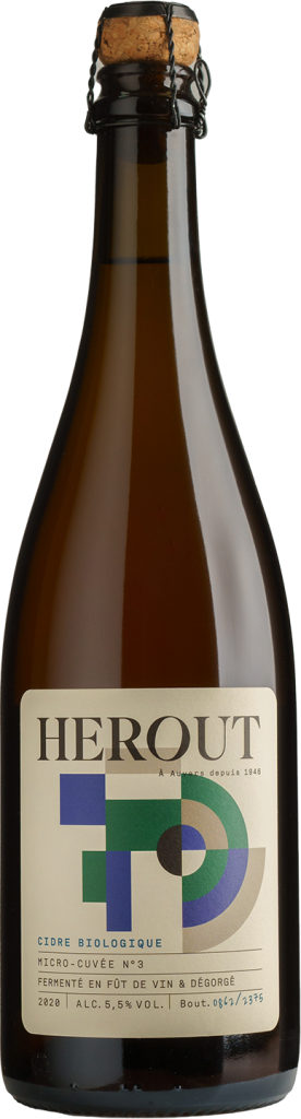 Herout, Micro-Cuvee №3, Biologique — органический газированный сидр, в производстве которого используется натуральный яблочный сок. Maison Hérout имеет фруктовый сад площадью 10 га, состоящий из высокоствольных (30%) и низкостебельных (70%) садов. Средний возраст яблонь варьируется от 10 до 65 лет. В саду представлено более 25 сортов яблок. После получения яблочного жмыха (мякоти, полученной после перетирания яблок) происходит кюваж (мацерация мякоти) перед прессованием. Сок отстаивается в течение 3-5 дней, после чего начинается спиртовое брожение. Для сидра "Herout" Micro-Cuvee n°3 ферментация в течение 6 месяцев проводилась в бургундских дубовых бочках из-под вина Пино Нуар и Шардоне. После бутилирования сидр выдерживается на осадке в течение 20 месяцев.