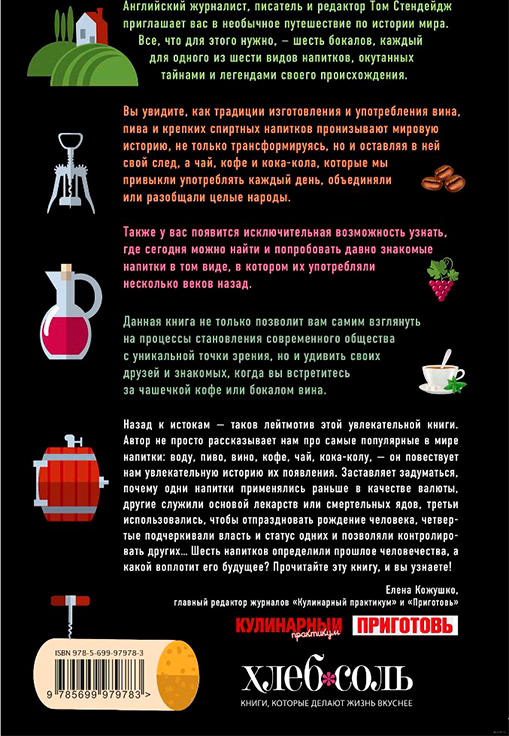 Взгляд на историю через бокал. Иногда на ход истории влияют веьсма необычные вещи. Наша книга - это уникальное исследование о том, как 6 всем известных напитков помогли сделать мир таким, каим он является сейчас. Автор повествует об истории человечества начиная с каменного века и до наших дней через призму пива,вина, крепких напитков, чая, кофе и даже колы. Где впервые было сварено пиво и как оно превратилось в оплату труда? Как греукам удалось распростанить свою культуру далеко за своими границами при повощи вина? Почему крепкие напитки придумали арабы, а потребность в них появилась у английских колонизаторов? Как кофе породил революционные идеи в Эпоху Разума? Как китайский чай покорил Англию и изменил ее внешнюю политику? Почему содовая приобрела такую популярность лишь через 2 века после изобретения и как Кока-Кола стала символом глобализации?