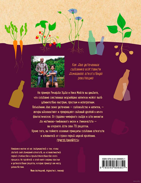 На примере Ричарда Худа и Ника Мойла вы увидите, что создание собственных вкуснейших напитков может быть удивительно быстрым, простым и незатратным. Объединив два своих увлечения — садоводство и напитки, — авторы вдохновляют и превращают садовый урожай в нечто фантастическое. От грушево-имбирного сидра и эля викингов до малиново-тимьянового виски и лимончелло — вы откроете для себя 70 рецептов. Кроме того, вы поймете основные принципы создания алкоголя и избавитесь от страха перед наукой брожения.