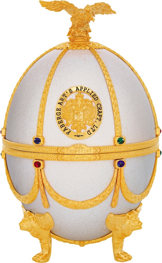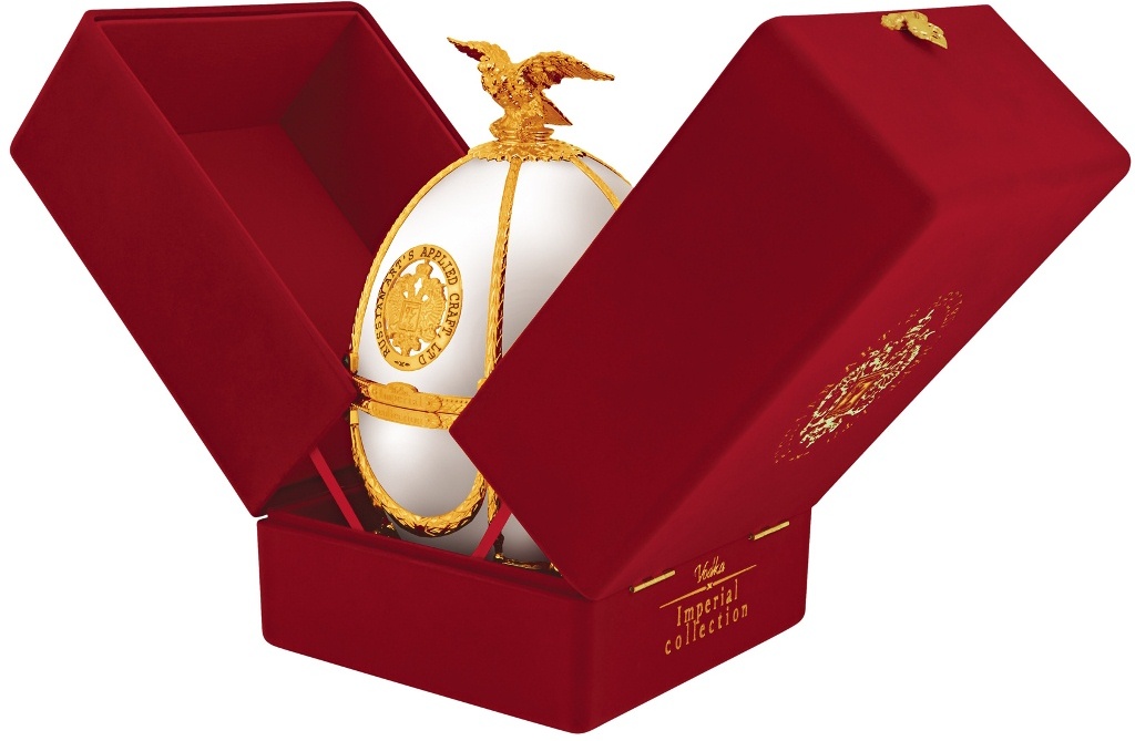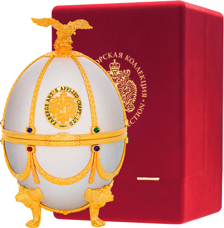 Императорская Коллекция — водка супер-премиум класса, созданная дарить истинное удовольствие. Ее разливают в графин, который изготовлен из венецианского стекла и декорирован разноцветными камнями и натуральной позолотой. Уникальный футляр, выполненный в форме яйца работы всемирно известного Карла Фаберже, с первых секунд привлекает к себе внимание. Футляр-яйцо покрыт эмалью и украшен аналогично графину. В набор также входят 4 рюмки, изготовленные вручную из венецианского стекла, и прикрепленные на кронштейн золотистого цвета.