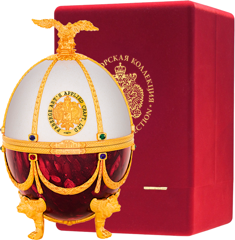Императорская Коллекция — водка супер-премиум класса, созданная дарить истинное удовольствие. Ее разливают в графин, который изготовлен из венецианского стекла и декорирован разноцветными камнями и натуральной позолотой. Уникальный футляр, выполненный в форме яйца работы всемирно известного Карла Фаберже, с первых секунд привлекает к себе внимание. Футляр-яйцо покрыт эмалью и украшен аналогично графину. В набор также входят 4 рюмки, изготовленные вручную из венецианского стекла, и прикрепленные на кронштейн золотистого цвета.
