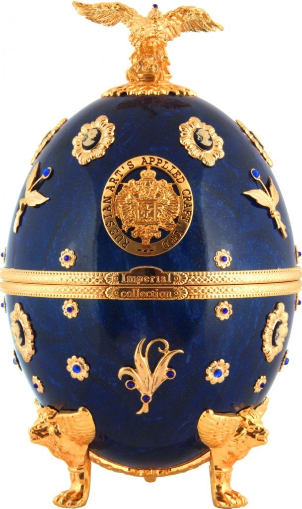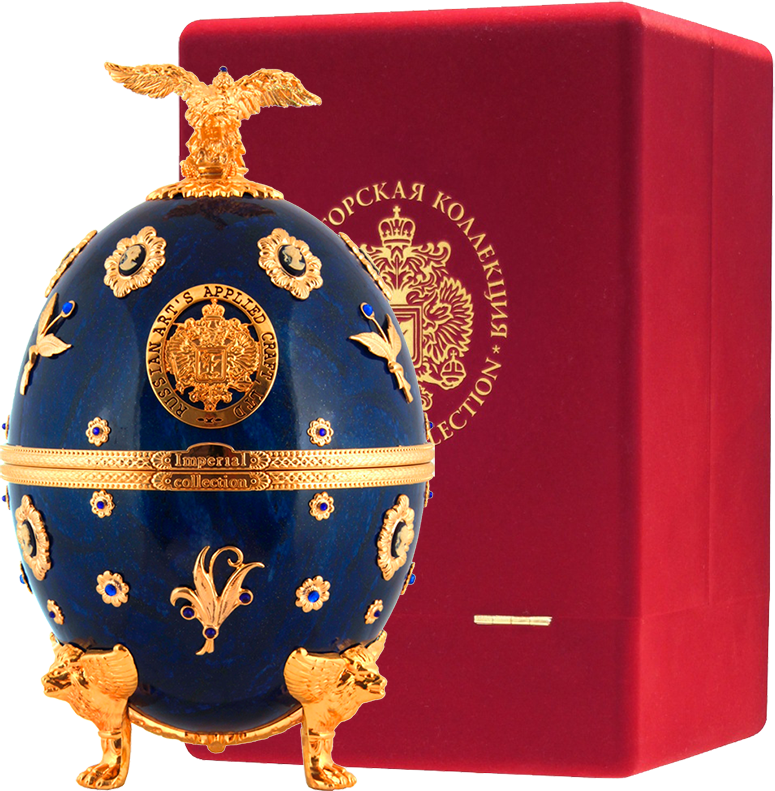Императорская Коллекция — водка супер-премиум класса, созданная дарить истинное удовольствие. Ее разливают в графин, который изготовлен из венецианского стекла и декорирован разноцветными камнями и натуральной позолотой. Уникальный футляр, выполненный в форме яйца работы всемирно известного Карла Фаберже, с первых секунд привлекает к себе внимание. Футляр-яйцо покрыт эмалью и украшен аналогично графину. В набор также входят 4 рюмки, изготовленные вручную из венецианского стекла, и прикрепленные на кронштейн золотистого цвета.