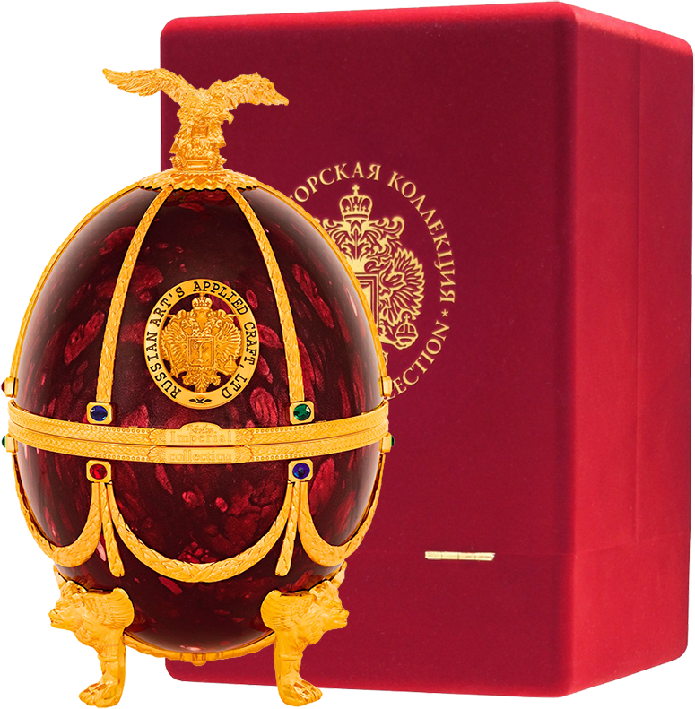 Императорская Коллекция — водка супер-премиум класса, созданная дарить истинное удовольствие. Ее разливают в графин, который изготовлен из венецианского стекла и декорирован разноцветными камнями и натуральной позолотой. Уникальный футляр, выполненный в форме яйца работы всемирно известного Карла Фаберже, с первых секунд привлекает к себе внимание. Футляр-яйцо покрыт эмалью и украшен аналогично графину. В набор также входят 4 рюмки, изготовленные вручную из венецианского стекла, и прикрепленные на кронштейн золотистого цвета.