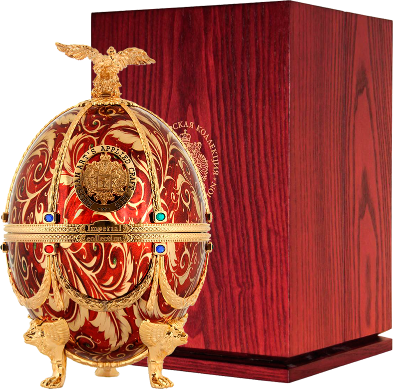 Императорская Коллекция — водка супер-премиум класса, созданная дарить истинное удовольствие. Ее разливают в графин, который изготовлен из венецианского стекла и декорирован разноцветными камнями и натуральной позолотой. Уникальный футляр, выполненный в форме яйца работы всемирно известного Карла Фаберже, с первых секунд привлекает к себе внимание. Футляр-яйцо покрыт эмалью и украшен аналогично графину. В набор также входят 4 рюмки, изготовленные вручную из венецианского стекла, и прикрепленные на кронштейн золотистого цвета.