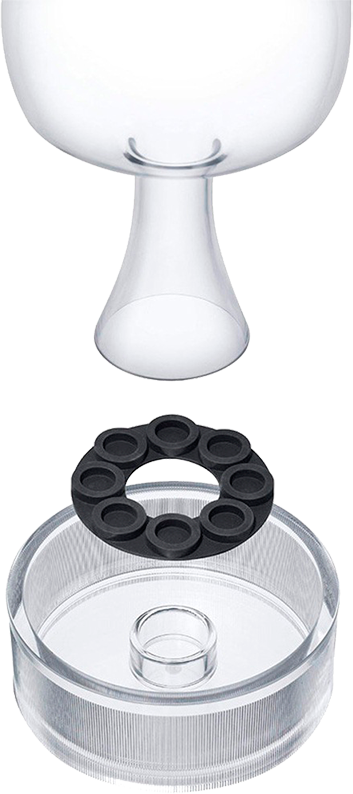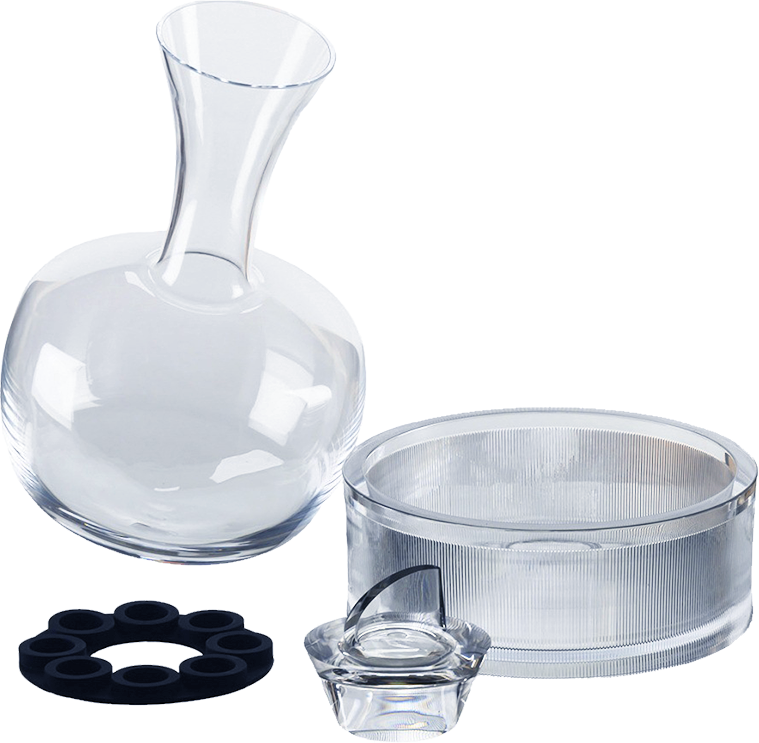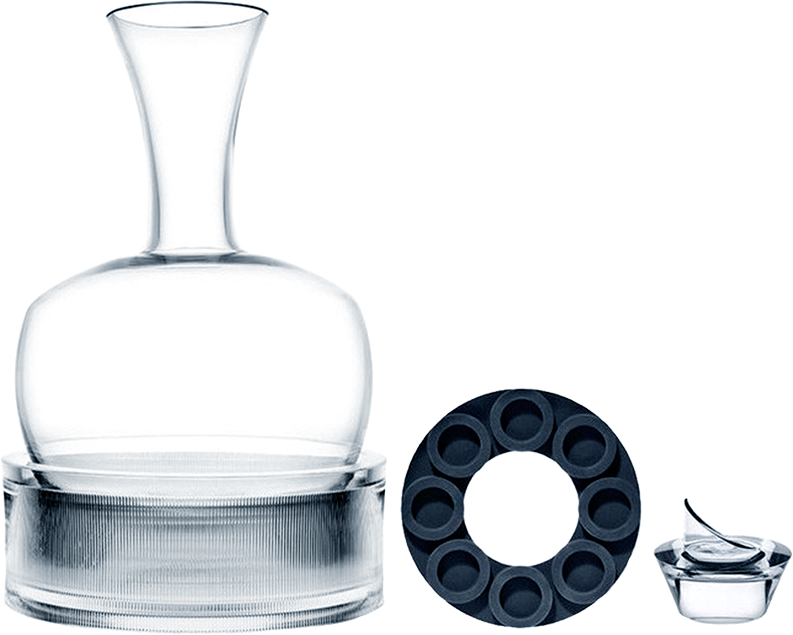 Декантер Italesse Alavin Transparent Base имеет продуманную эргономику. Удлиненная горловина облегчает удерживание сосуда, а специальная форма горлышка предотвращает прокапывание вина. В комплекте с декантером идет специальная подставка прозрачного цвета. В нее можно положить лед, чтобы охладить алкоголь и сохранить его свежесть. Также подставка более прочно удерживает сосуд на столешнице, не позволяя его опрокинуть или разбить. Для закупоривания декантера предусмотрена элегантная крышка. С ней алкоголь не утратит свой изысканный аромат.
