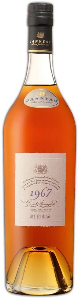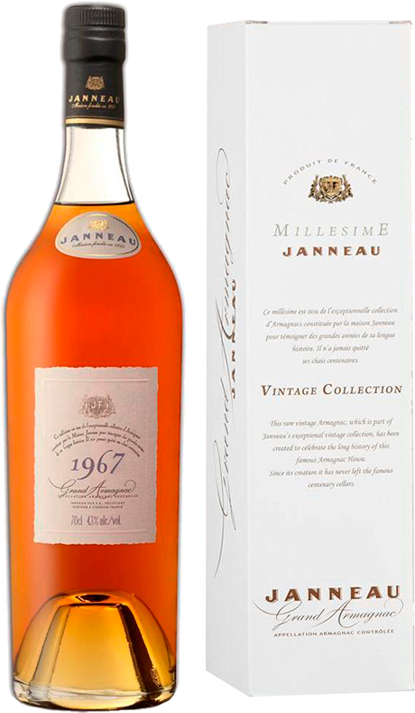 Janneau, Vintage Collection, 1967 — прекрасный винтажный арманьяк, полученный в результате однократной дистилляции вина из винограда сортов Бако, который является преобладающим в винтаже, и Уни Блан. Ягоды были собраны с виноградных лоз, произрастающих на глинисто-известняковых почвах региона Тенарез и так называемых "рыжих песках" региона Бас-Арманьяк. Винтажный арманьяк является отражением урожая года, указанного на этикетке, и выдержан не менее 39 лет в 450-литровых бочках, изготовленных из дубов местных лесов Limousin и Monlezun. Каждая бочка имеет свои характеристики, которые позволяют обогатить напиток древесными ароматами, типичным янтарным цветом и тонким танинным вкусом. Выдержка проходит в старинных подвалах, построенных еще в 1851 году, где 10% всего арманьяка региона отдыхает в полной тишине. Когда содержимое бочек достигнет нужного возраста, его смешивают в определенных пропорциях в зависимости от сорта винограда, возраста и способа дистилляции. Благодаря мастерству купажистов, подкрепленному не только опытом и квалификацией, но и переходящими секретами старинных рецептов, каждый винтаж имеет свой стиль, крепость, аромат, вкус и цвет. После купажирования арманьяк дозревает в течение 6 месяцев в бочках на 18000 литров, чтобы достичь состояния полной однородности перед розливом по бутылкам. Фактическая дата розлива всегда печатается на задней этикетке. Винтажный арманьяк может стать прекрасным подарком для ценителей этого напитка, особенно если год урожая совпадает с годом рождения.