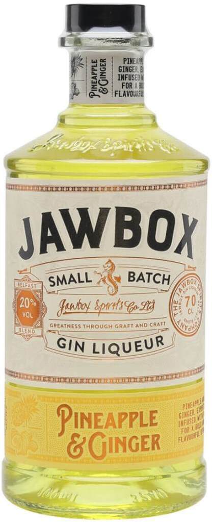Jawbox, Pineapple & Ginger — ароматный ликер на основе джина "Jawbox" Small Batch с ананасом и имбирём. Ликер представляет собой идеальное сочетание фруктовой сладости и имбирной пряности, дополненное уникальным шлейфом из растительных компонентов классического джина. Этот ликер вызывает желание им поделиться с близкими и разделить приятно вкусные моменты, что полностью соответствует концепции бренда. "Джоубокс" Ананас & Имбирь идеально подходит для приготовления пунша со свежими фруктами или сочетания с имбирным элем.