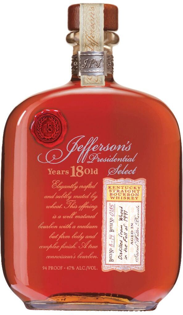 Jefferson’s, Presidential Select, 18 Years Old — уникальный, редкий бурбон премиум-класса, созревание и розлив которого были произведены на винокурне Stitzel-Weller Distillery в Луисвилле. Изготовленный из пшеницы урожая 1991 года и выдержанный в течение 18 лет, бурбон выпущен в небольшом количестве, каждая партия имеет уникальный номер. Он входит в серию "Президентский выбор", включающую "старые" пшеничные и ржаные бурбоны длительного созревания: от 17 до 30 лет.
