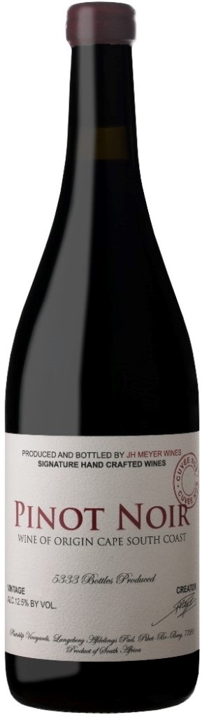 Johan Meyer, Pinot Noir Cuvee NOS, Cape South Coast — изысканное вино из винограда сорта Пино Нуар, собранного в трех регионах - Elgin, Elands Kloof и Hemel-en-Aarde. Все виноградники сертифицированы как органические, лозы возрастом 12-18 лет. Виноград собирается вручную ранним прохладным утром в небольшие ящики и отправляется на винодельню, где ферментируется целыми гроздями в течение 10 дней при температуре в 30 градусов, а после остается еще на 20 дней в контакте с кожицей. Выдержка проходит в больших старых бочках из французского дуба объемом 2000 литров в течение 11 месяцев. Вино бутилируется без фильтрации и добавления сульфитов.