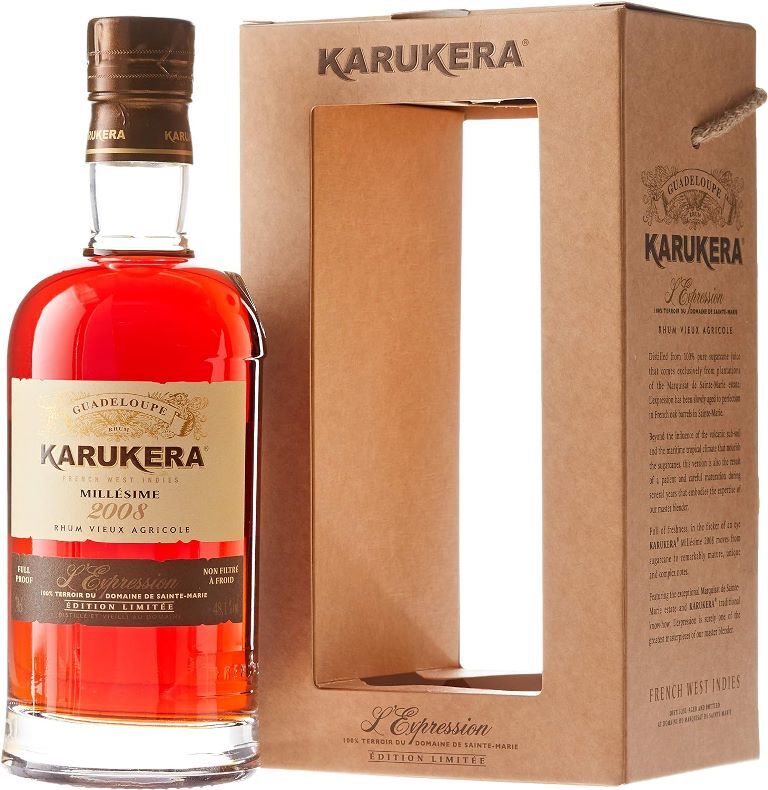 Karukera, L'Expression, 2008 — свежий, энергичный, невероятно сложный и богатый ром с тонкой минеральностью во вкусе и душистым ароматом. Ром изготовлен из свежевыжатого сока сахарного тростника сорта Blue Cane. Сахарный тростник собирают вручную, тщательно отбирают и незамедлительно отправляют на ликероводочный завод, чтобы сохранить его богатый аромат. Интенсивность и душистость рома является результатом тщательного процесса дистилляции, а также длительного созревания. При изготовлении рома не применяется холодная фильтрация, что позволяет сохранить его органолептические характеристики в полном объеме.